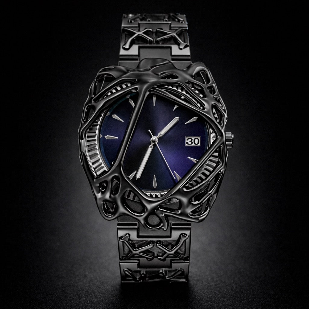 The watch is made with stainless steel, sculpted into an ornate skeletal frame that wraps around the dial like gothic armor. This premium alloy construction gives the watch a durable, corrosion-resistant, and beautifully weighted feel on the wrist.